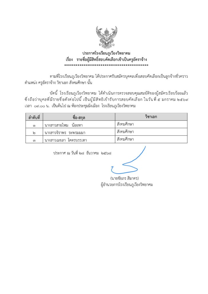 บัดนี้ โรงเรียนภูเวียงวิทยาคม ได้ดำเนินการตรวจสอบคุณสมบัติของผู้สมัครเรียบร้อยแล้ว ซึ่งถือว่าบุคลที่มีรายชื่อดังต่อไปนี้ เป็นผู้มีสิทธิเข้ารับการสอบคัดเลือก ในวันที่ ๕ มกราคม ๒๕๖๙ เวลา ๐๙.๐๐ น. เป็นต้นไป ณ ห้องประชุมมิ่งเมือง โรงเรียนภูเวียงวิทยาคม